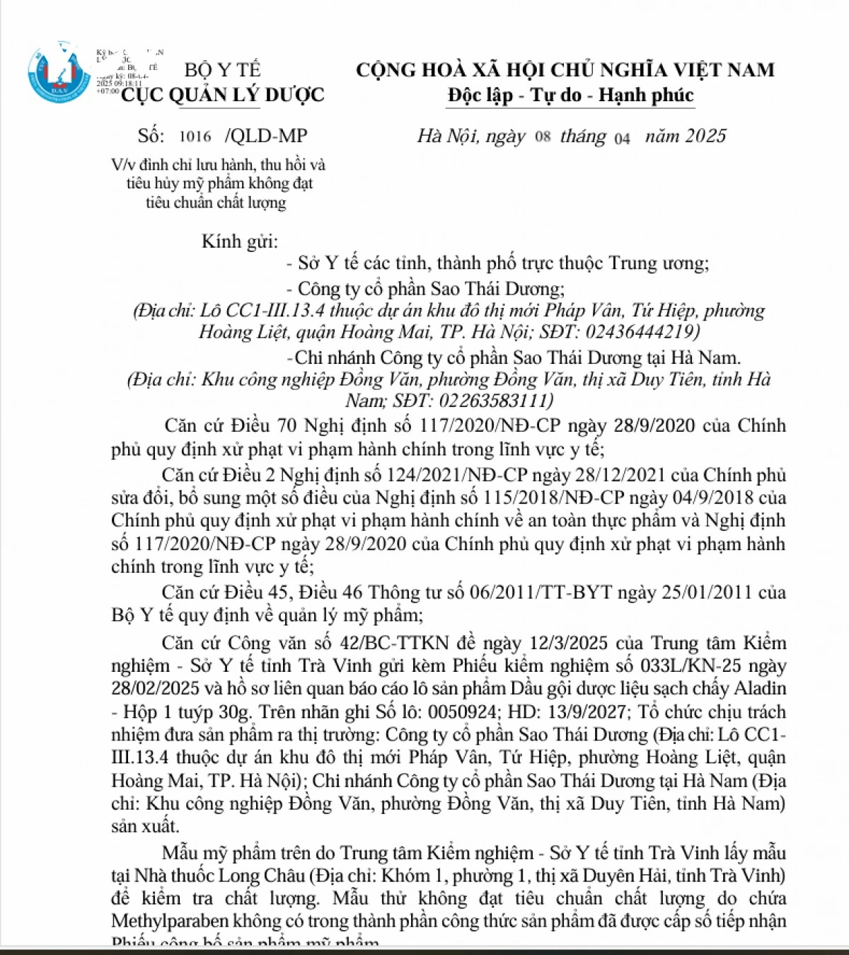 Ths, Luật sư Nguyễn Mạnh Thuật: Công văn số 1016/QLD-MP ngày 8/4/2025 của Cục Quản lý dược (Bộ Y Tế) đình chỉ lưu hành, thu hồi trên toàn quốc lô sản phẩm Dầu gội dược liệu sạch chấy Aladin do Công ty CP Sao Thái Dương đưa ra thị trường với lý do: "Mẫu kiểm nghiệm không đạt tiêu chuẩn chất lượng do chứa Methylparaben không có trong thành phần công thức sản phẩm đã được cấp số tiếp nhận Phiếu công bố sản phẩm mỹ phẩm".