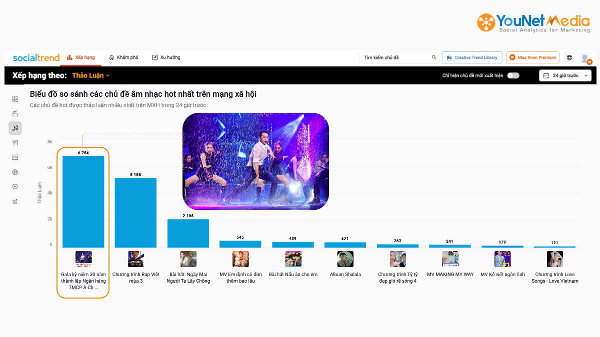 Tiết mục của Chủ tịch Trần Hùng Huy đứng thứ nhất trong bảng xếp hạng chủ đề âm nhạc "hot" trên mạng xã hội. Ảnh: YouNet SocialTrend.