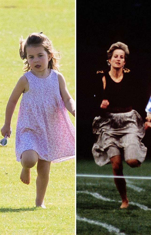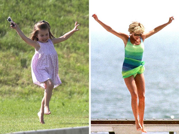 Điệu nhảy tung người tinh nghịch của Công chúa Charlotte trong dịp đi xem trận polo có Hoàng tử William thi đấu tháng trước giống với hành động của bà nội cô bé khi Công nương Diana tận hưởng mùa hè tại St Tropez năm 1997.
