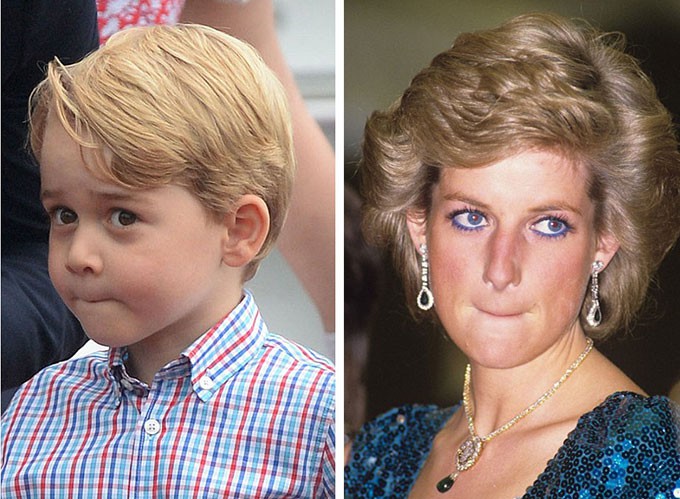 Hoàng tử bé George bặm chặt môi trong chuyến công du Ba Lan năm 2017 và bức hình chụp biểu cảm tương tự của Công nương Diana quá cố vào năm 1989 khi hôn nhân của bà với Thái tử Charles đang trên bờ vực đổ vỡ.