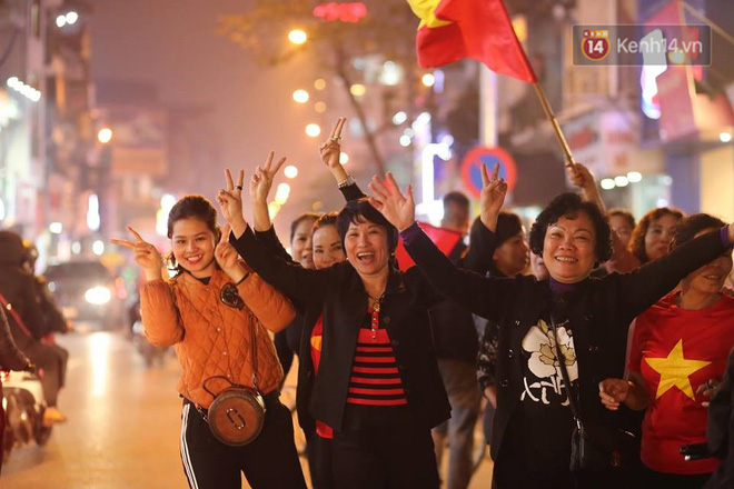 Không chỉ có các bạn trẻ, nhiều cô bác dù đã lớn tuổi nhưng cũng đổ ra đường cùng nhau ăn mừng chiến thắng tuyệt vời của ĐT Việt Nam.