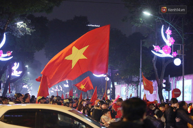Thời tiết Hà Nội dù không hề ấm áp, nhưng không sao cả, tinh thần ăn mừng chiến thắng cuồng nhiệt của hàng nghìn CĐV đang vô cùng nóng bỏng. Tại phố đi bộ Hồ Gươm và các con đường lân cận, CĐV đã đổ về đây rất đông đúc, mang theo cờ, hoa, hò reo ăn mừng chiến thắng lịch sử.