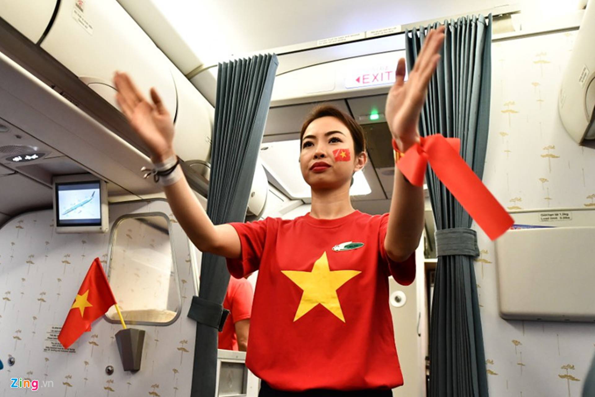 | Từ 4h sáng, đã có rất đông các cổ động viên (CĐV) Việt Nam nhuộm đỏ rực một góc quầy làm thủ tục tại ga đi quốc tế Tân Sơn Nhất, với đồng phục áo hình quốc kỳ Việt Nam. |