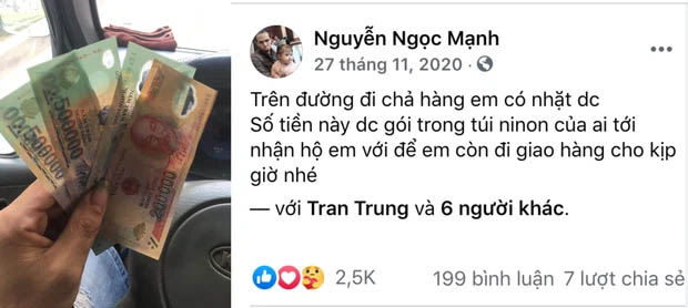 Ít ai biết rằng trước khi "nổi tiếng" với hành động nghĩa hiệp của mình, anh Mạnh còn đã làm một việc tốt khác đó chính là tìm người đánh rơi tiền để trả lại. Theo đó vào ngày 27/11/2020, anh Mạnh kể trên Facebook rằng khi mình đi trả hàng thì nhặt được số tiền của ai đó đánh rơi. Anh chụp ảnh ngay 4 tờ tiền với tổng giá trị 1,7 triệu đồng để đăng lên mạng, hy vọng rằng có thể tìm được người làm mất.