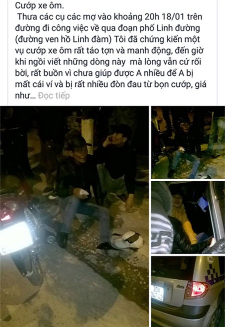 Thưa các cụ, các mợ vào khoảng 20h ngày 18/01, trên đường đi công việc về qua đoạn phố Linh Đường (đường ven hồ Linh Đàm), tôi đã chứng kiến một vụ cướp xe ôm rất táo tợn và manh động.