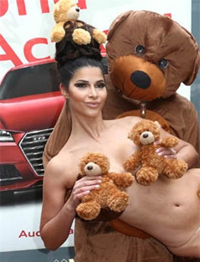 Bất chấp thời tiết giá lạnh xuống tới 0 độ C tại đây, Micaela Schäfer vẫn dũng cảm mặc một bộ đồ được tạo nên bởi... 3 con gấu bông. Không chỉ thế Micaela còn bới tóc cầu kỳ và trang trí cũng bằng một con gấu bông màu vàng trên đầu.