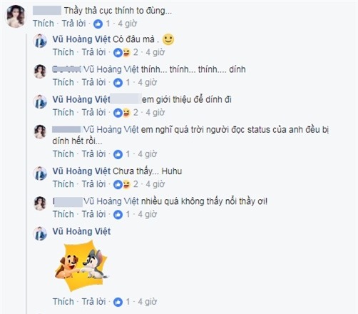 Sau khi chia sẻ trạng thái này, có nhiều bạn của Vũ Hoàng Việt đòi giới thiệu bạn gái cho nam người mẫu. Đáp lại những ý kiến đó, Vũ Hoàng Việt không hề từ chối. |