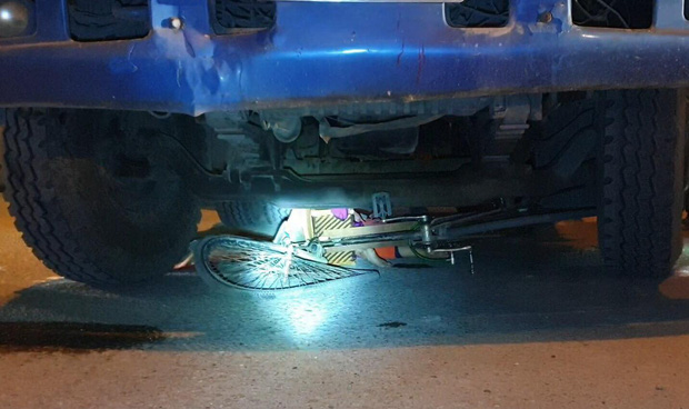 Chiếc xe đạp bị xe container cuốn vào gầm.