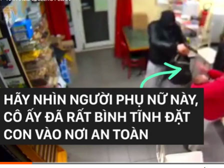 Đối mặt với tình huống nguy hiểm, người phụ nữ được cho là chủ cửa hàng đã bình thản đặt con nhỏ vào chỗ an toán, sau đó, bình tĩnh quay ra tay không đối mặt với tên cướp hung tợn.