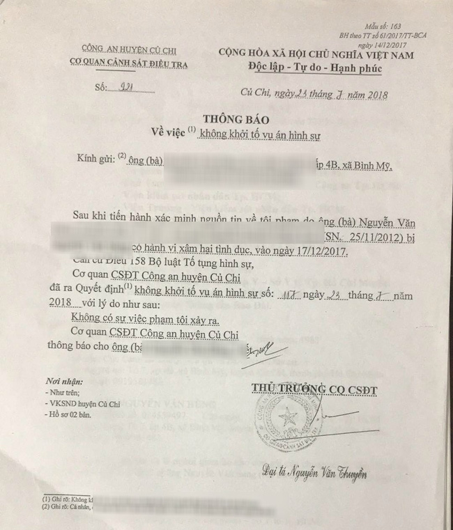 Tìm đến Hội Bảo vệ Quyền trẻ em như một lời cầu cứu, chị V. cho biết từ khi xảy ra vụ việc, cuộc sống gia đình chị bị đảo lộn hoàn toàn, sau nhiều ngày tháng chờ đợi kết quả từ Cơ quan CSĐT Công an huyện Củ Chi, chị bàng hoàng khi nhận được kết quả không khởi tố vụ án hình sự vào ngày 23/7/2018 với lý do được đưa ra là không có sự việc ông S. hiếp dâm con gái chị.