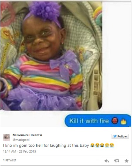Tuy nhiên, ngày hạnh phúc của gia đình nhanh chóng trở nên đen tối khi bức ảnh của Mariah nhanh chóng được chia sẻ trên mạng với những bình luận vô cùng khiếm nhã về cô bé như "xấu xí" hay "trông cô bé như yêu tinh"... Nhiều người thậm chí còn dùng bức ảnh của Mariah để làm ảnh chế.