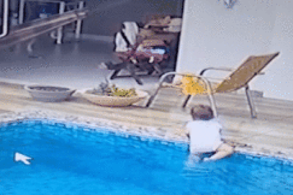 Trong khi người mẹ đang nói chuyện điện thoại và chờ ở bên ngoài cửa thang máy ở tầng 4, thì em bé tiến sát lại lan can rồi ngã cắm đầu xuống dưới. May mắn là người mẹ đã phát hiện ra sự việc và nhanh chóng chồm tới, nắm lấy chân bé rồi kéo lên trước sự trợ giúp của hàng xóm.