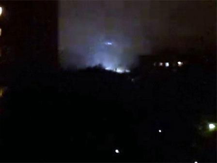 UFO với luồng sáng chói loà hạ cánh khuất sau những toà nhà cao tầng ở Moscow. |