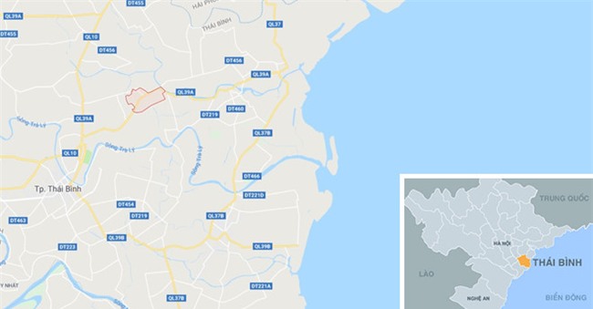 | Xã Đông Tân, huyện Đông Hưng (ô đỏ) nơi xảy ra vụ việc. Ảnh: Google Maps. |