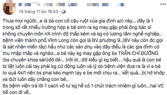Theo đó, nick P.T đăng dòng trạng thái: "Đây là 1 trong số rất nhiều trường hợp em bé sinh ra không may gặp phải ông bác sĩ không chuyên môn và trình độ thấp kém, không có lương tâm nghề nghiệp… Trời ơi...đỡ đẻ kiểu gì không biết... hậu quả là con bé bị liệt luôn cái tay phải không cử động luôn và lý do bệnh viện đưa ra là vì e bé to quá tới 4,1 kg nên bác sĩ phải kéo mạnh tay em bé mới chịu ra. Kết quả là bé bị hở khớp và đứt luôn dây chằng…". Dòng trạng thái này đã có hàng ngàn lượt chia sẻ và bình luận.
