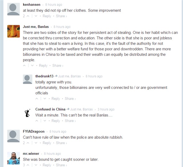 Trong khi đó một lập luận trái chiều từ một cư dân mạng tại Sơn Đông, Trung Quốc, cho hay."Tôi đồng tình với hành động này. Nếu cô ấy không muốn bị xấu mặt thì không nên có hành vi trộm cắp đó".