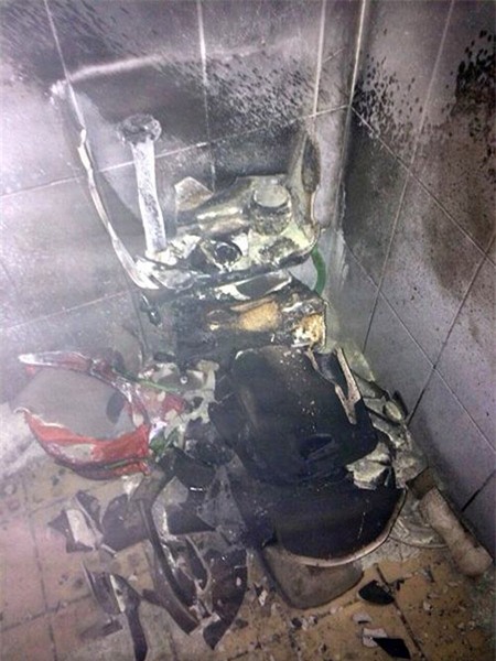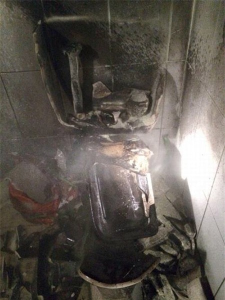 lửa lan sang cả khu văn phòng nơi thuê chị dọn rửa, chiếc toilet đen vỡ