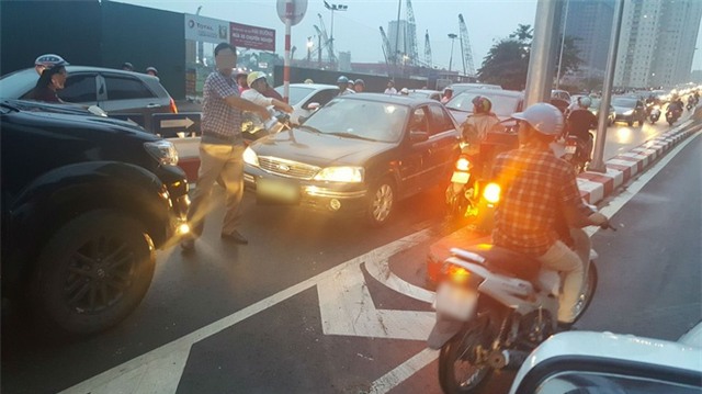 Trong bức ảnh được chụp lại trên phố Hà Nội, một người phụ nữ đi xe đỏ đang rất bình thản đỗ xe dưới dòng đường – đỗ ngược chiều chứ chẳng phải cùng chiều với các xe đang lưu thông.