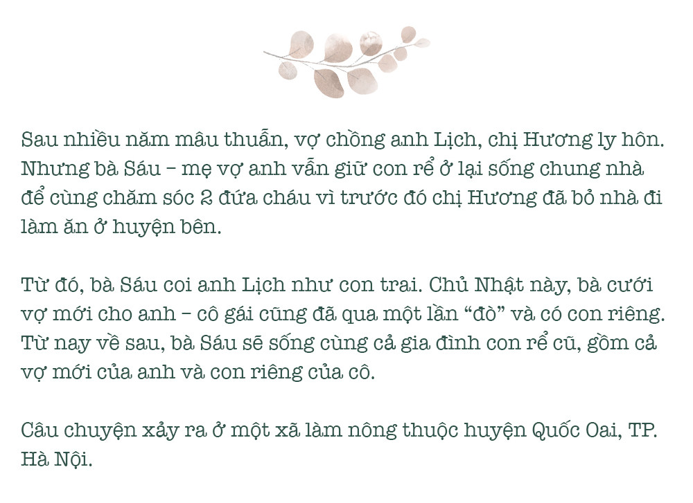 “Họ bên ấy nhất quyết đòi gặp ‘bà mẹ vợ của anh Lịch’ bằng được để xem mình trông như thế nào”. Vì thế, bà cũng theo chân con rể cũ sang nhà gái thưa chuyện và nhận được những lời chúc mừng, khen ngợi, ủng hộ hôn nhân mới của 2 người trẻ cùng chung hoàn cảnh muốn nương tựa vào nhau.