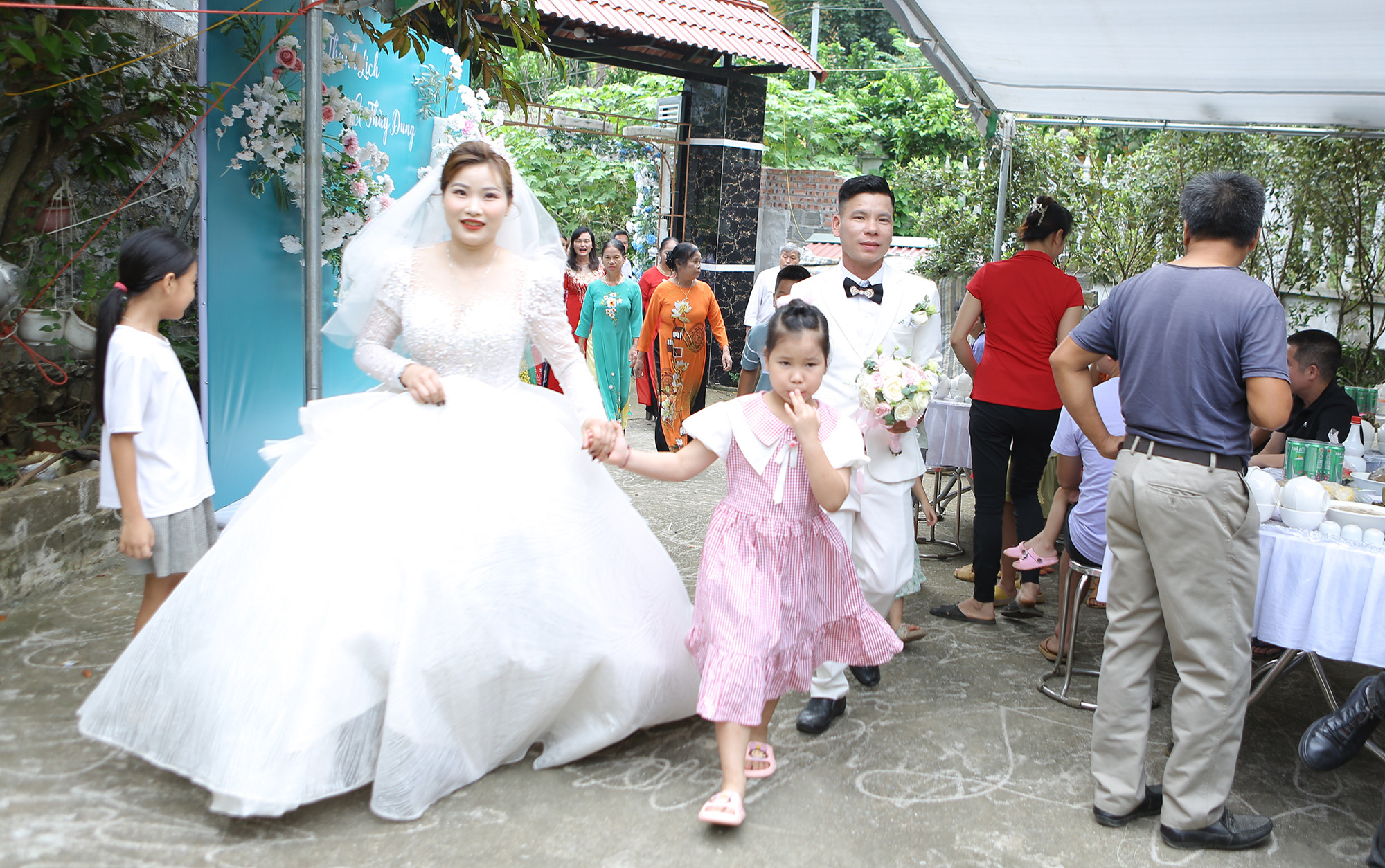 Đám cưới của Lịch cũng được bà chuẩn bị đầy đủ các hạng mục: cổng cưới kết hoa, phông bạt, sân khấu, bàn ghế chật kín sân. “Tôi chỉ làm năm chục mâm, đó chỉ là toàn họ hàng, con cháu trong nhà và nhà gái, không mời làng xóm vì sợ mang tiếng. Người ta lại bảo cưới lần 2 mà mở rộng để lấy phong bì” - bà Sáu thật thà chia sẻ.
