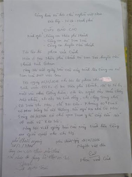 Lá đơn gia đình bà Ba nhờ cơ quan chức năng can thiệp |