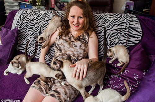 Kelly Cruse, 33 tuổi, sống tại Plymouth, Devon (Anh) tự nhận mình là người phụ nữ “cuồng mèo” vì cô không thể sống mà thiếu mèo. Kelly có một bộ sưu tập thú cưng “khủng” với 35 con mèo Snowshoe (giống mèo Xiêm cực hiếm), năm con chó Chihuahua và một con chó doberman. Mỗi năm, Kelly phải chi đến 15.000£ (hơn 510 triệu VNĐ) tiền trả bác sĩ thú y, bảo hiểm vật nuôi và thức ăn, nhưng Kelly chưa bao giờ thấy phiền lòng và cho biết cô luôn để dành sẵn một khoản cho thú cưng.