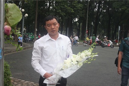 Có người chuẩn bị lẵng hoa tươi kèm với tấm ảnh của Đại tướng để dâng lên Người.