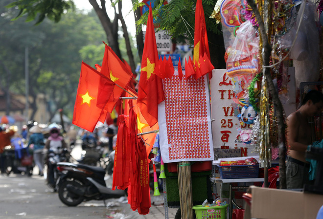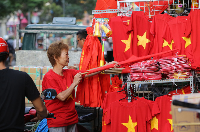 Ngoài những lá cờ tổ quốc, áo màu đỏ in sao vàng cũng là mặt hàng bán chạy do được người hâm mộ ưa chuộng. "Cờ thường bán 30.000 đồng còn áo 50.000 đồng. Nếu bán lẻ ở vỉa hè có thể giá sẽ cao hơn" - chủ tiệm chia sẻ.