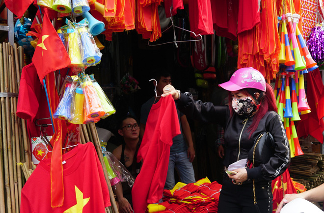 Nhiều người đi sắm đồ cổ động cho kịp giờ đón xem trận đấu bán kết giữa U23 Việt Nam và Hàn Quốc.