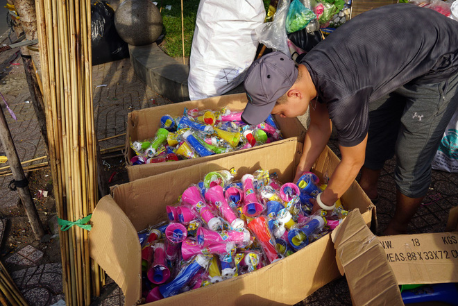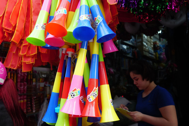 Kèn là một vật dụng không thể thiếu của các động viên. Một nam thanh niên đang vận chuyển những thùng kèn ra vỉa hè bày bán.