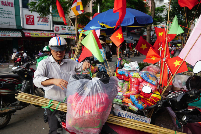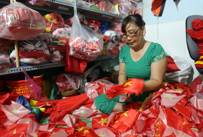 Một vựa sản xuất cờ, băng rôn ở quận Gò Vấp hối hả làm việc để cung cấp sản phẩm ra thị trường. Mặt hàng bán chạy nhất là những lá cờ chỉ nhỏ bằng bàn tay.