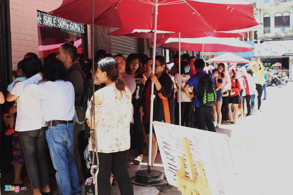 Vì quá đông người, các nhân viên phải liên tục điều phối khách xếp hàng. Mỗi đợt chỉ có 5 lượt khách vào bên trong lựa mua sầu riêng. Trung bình, mỗi người vào bên trong mua trong khoảng 15-20 phút.