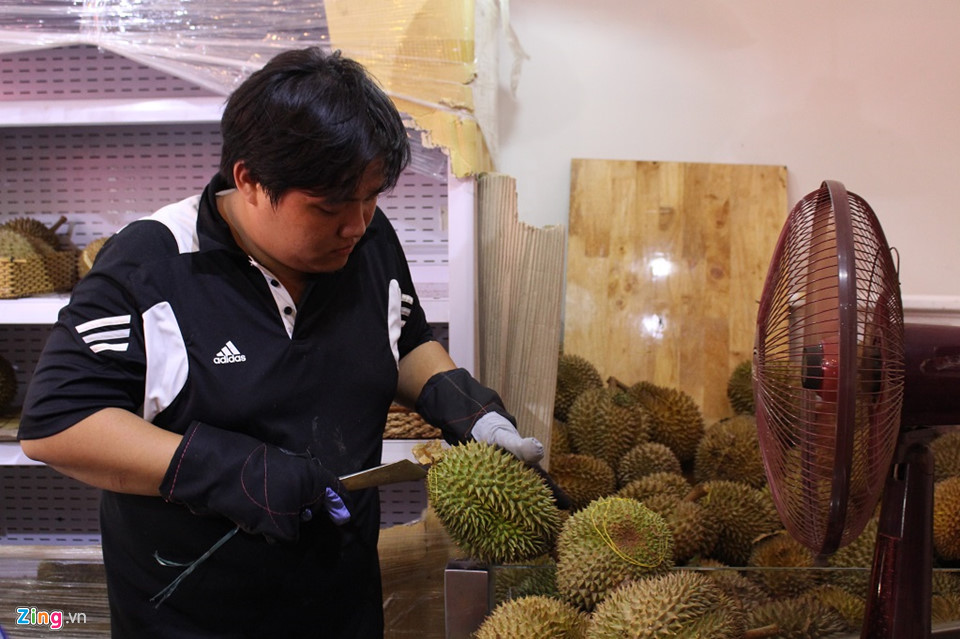 Chủ cửa hàng cho hay ngay sau khi sầu riêng được chở về, anh và các nhân viên phải nhanh chóng kiểm tra độ chín trước rồi mới để lên kệ bán, để khách hàng đỡ mất thời gian lựa chọn.