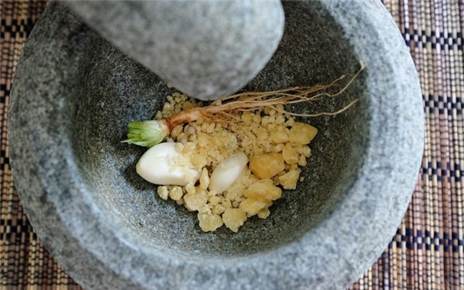 Cho đường thốt nốt, tỏi, rễ cây ngò vào cối giã nhuyễn. Tiếp đến cho nước tương, dầu hào, tiêu xay vào trộn đều.