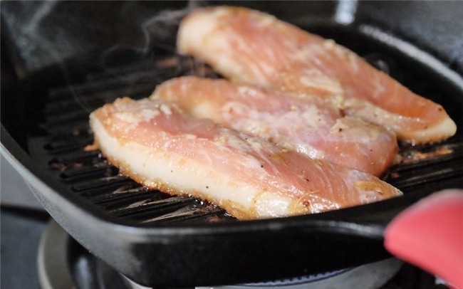 Bắc chảo lên bếp, phết lên một lớp mỏng dầu ăn sau đó cho thịt heo vào áp chảo.