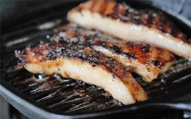 Khi một mặt chuyển màu vàng nâu, cháy cạnh thì trở mặt còn lại, cho đến khi thịt heo chín thì vớt ra dĩa rồi cắt miếng vừa ăn. Khi ăn chấm thịt cùng hỗn hợp sốt ở bước 3.