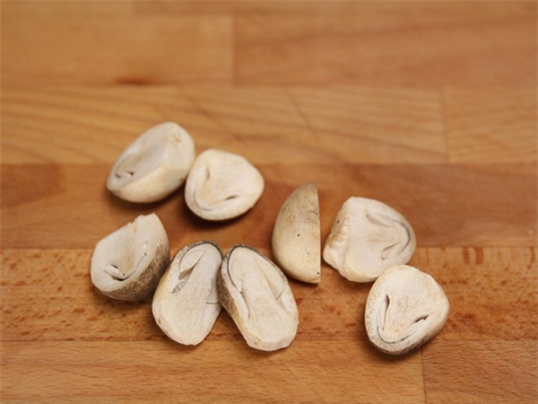 Nấm cắt chân, rửa nhẹ nhàng dưới vòi nước chảy rồi bổ làm đôi.