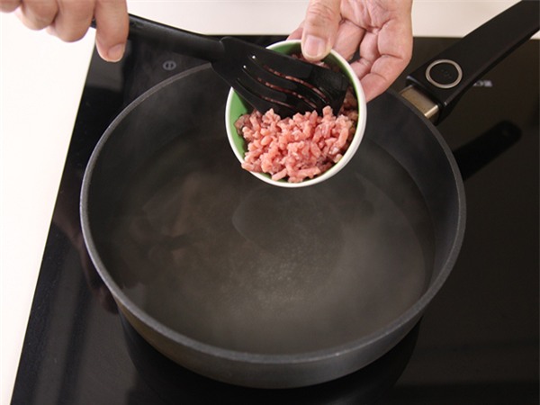 Đun sôi nồi nước dùng gà rồi trút thịt lợn băm nhỏ vào, nấu sôi cho ngọt nước.