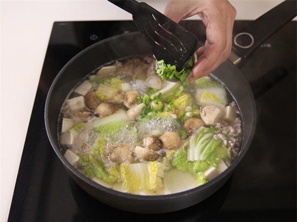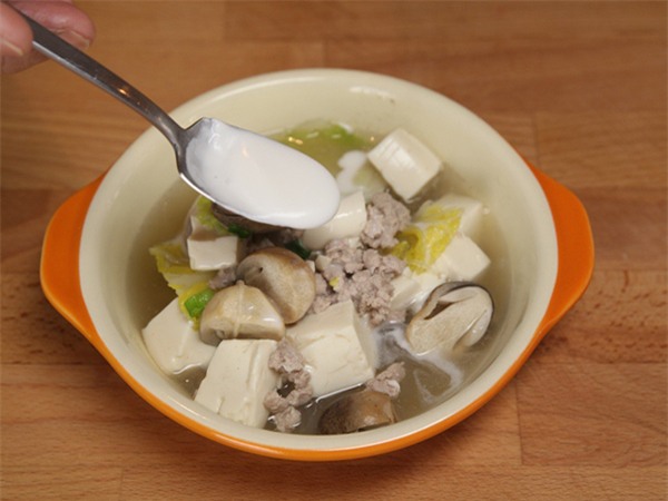 Thêm đậu phụ, miến, cải thảo, nấm và nước mắm vào, khuấy đều.
