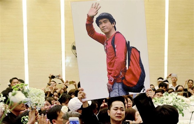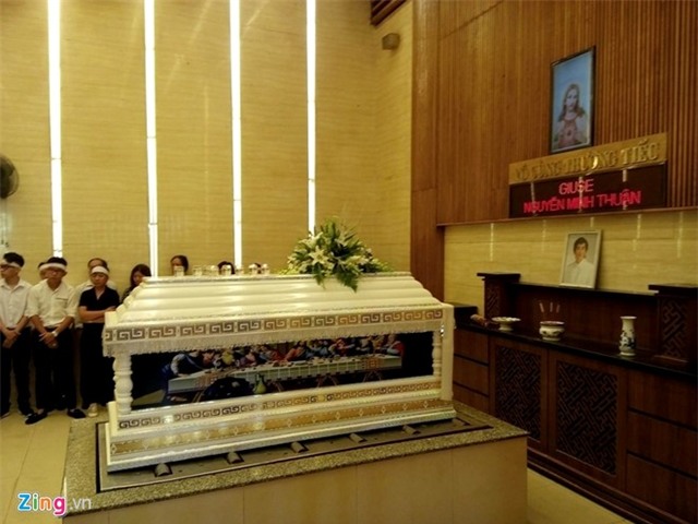 Bức ảnh Minh Thuận vẫy tay chào được người nhà lựa chọn để đặt bên cạnh linh cữu, như cách giúp nam ca sĩ nói lời tạm biệt gia đình, những người thân yêu, bạn bè, đồng nghiệp. Nam ca sĩ Quách Tuấn Du vừa khóc vừa giơ bức ảnh Minh Thuận.