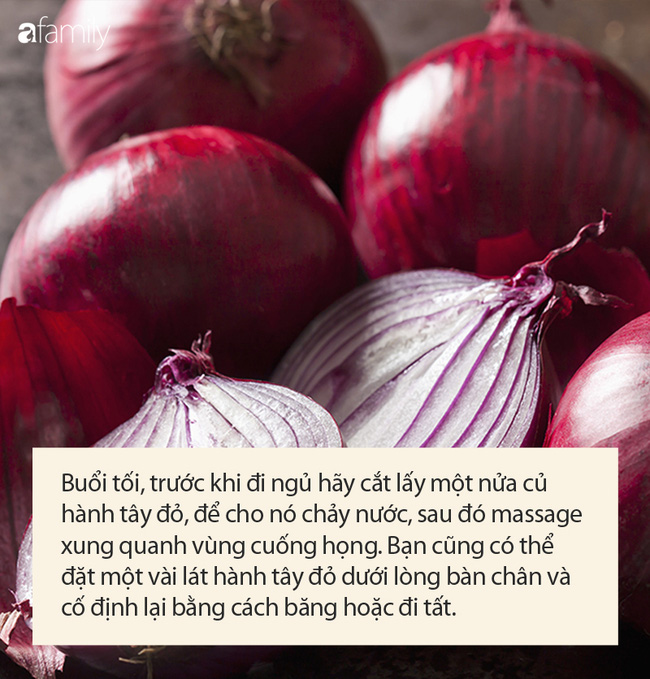 Bạn chỉ cần thực hiện theo những bước đơn giản sau: Buổi tối, trước khi đi ngủ hãy cắt lấy một nửa củ hành tây đỏ, xát vào vùng cuống họng, sau đó massage xung quanh vùng cuống họng với chuyển động hình tròn trơn tru. Sau đó, bạn có thể đi ngủ và không được rửa cổ, vì nước hành tây đỏ sẽ phát huy hiệu lực ngay cả khi bạn đang say giấc.