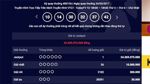 Với dãy số 10-14-30-32-37-42, kỳ quay thứ 106 đã xác định có 1 vé trúng giải được bán ra. Tổng giá trị của giải lần này là 24.369.075.000 đồng.