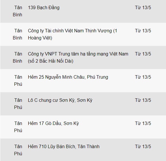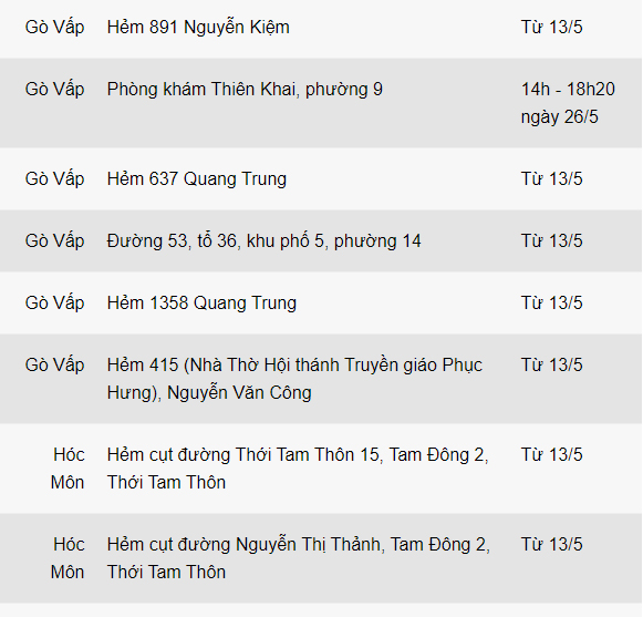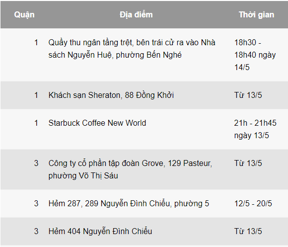Ngành y tế cũng gỡ bỏ điểm giám sát tại Bar New Phương Đông, 20 Đống Đa, Thuận Phước, Hải Châu từ 28/4 đến 7/5; đồng thời, sửa điểm giám sát tòa R1, R3, R4 chung cư Goldmark City (136 Hồ Tùng Mậu, quận Cầu Giấy) từ 20/5 thành tầng 23, block R4A, tòa R4, Goldmark City, Phú Diễn, Bắc Từ Liêm, Hà Nội.