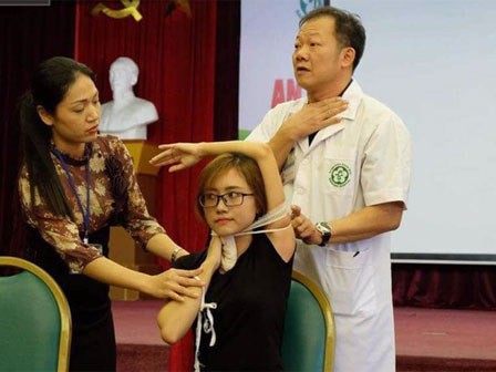 Tại buổi hướng dẫn, TS Dương Đức Hùng đã hướng dẫn trực tiếp trên người thật và bằng những dụng cụ, vật liệu có thể gặp trên đường như cành cây, que tre, bút bi hay thậm chí là chiếc áo xé ra...