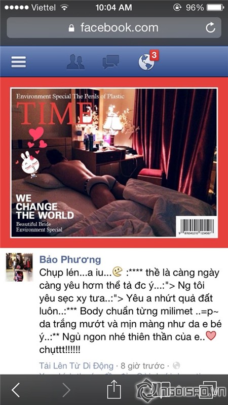 Trong ảnh, Cao Thái Sơn nằm xấp xuống giường, trên người chỉ mặc một chiếc quần... boxer nhỏ và dường như đang ngủ rất ngon lành. Không những thế, Bảo Phương còn thích thú chia sẻ: “Chụp lén anh yêu. Thề là càng ngày càng yêu hơm thể tả được ý. Người tôi yêu sexy chưa? Yêu anh nhứt quả đất luôn. Body chuẩn từng milimet, da trắng mướt và mịn màng như da em bé ý. Ngủ ngon nhé thiên thần của em. Chụt!”