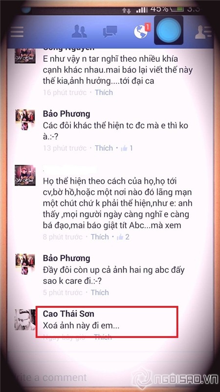 Khi phát hiện Bảo Phương tung ảnh "nhạy cảm" của mình, Cao Thái Sơn lập tức comment “Xóa ảnh này đi em” nhưng Bảo Phương vẫn kiên quyết để lại bức ảnh. “Bất lực” khi “người yêu đồn” không xóa ảnh, nam ca sĩ “Con đường mưa” đã xóa luôn cả comment của mình sau đó.