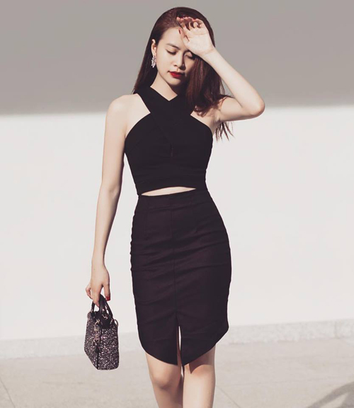 Người đẹp mặc chiếc áo lửng cut-out khoét nách sâu vào phần ngực, tôn phần ngực đầy đặn đồng thời khoe vòng eo nhỏ nhắn. Chiếc áo được kết hợp với chân váy bút chì ôm gọn eo, càng giúp vòng 2 của Hoàng Thùy Linh trở nên ấn tượng hơn.