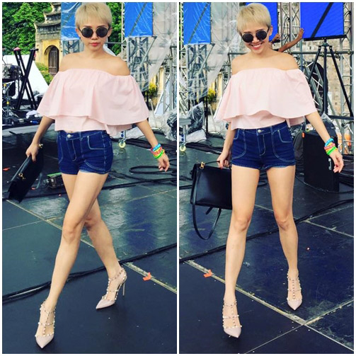 Phong cách trễ nải cùng áo trễ vai, kết hợp quần sooc chẽn rất gợi cảm của Tóc Tiên