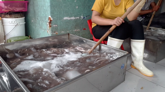 Tiếp đó, bạch tuộc được đổ vào 2 khay inox chứa một loại dung dịch màu nâu, sủi bọt trắng để tẩy trắng, khử mùi hôi trong vòng 30 phút.