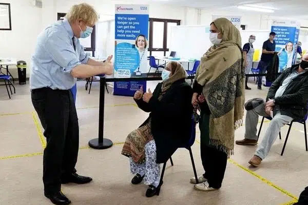 Thủ tướng Anh Boris Johnson đến thăm trung tâm tiêm vắc-xin ở hạt Tây Yorkshire – Anh hôm 1-2 Ảnh: Reuters